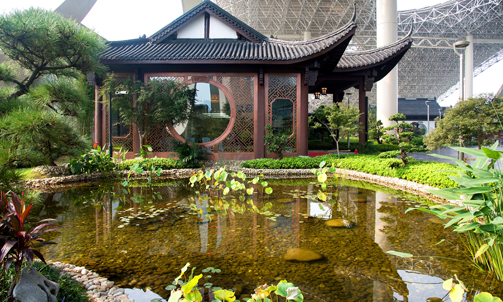 G20峰會(huì)主會(huì)場(chǎng)空中花園施工內(nèi)容包括屋頂花園景觀、仿古建筑、水體景觀積水循環(huán)系統(tǒng)等。屋頂花園整體以“西湖明珠從天降、龍飛鳳舞到錢塘”為設(shè)計(jì)理念,以典型的江南園林風(fēng)格為范本,吸收了中國(guó)古典園林中多種造景元素,詩意地闡釋了江南園林的獨(dú)特韻味。水景、植栽、石景和建筑相互輝映,傳統(tǒng)江南園林的工匠精神與哲學(xué)思考深蘊(yùn)其中,展現(xiàn)細(xì)致入微且非常玄妙的獨(dú)特美感。是國(guó)內(nèi)功能齊全,中國(guó)特色濃郁,生態(tài)環(huán)境優(yōu)美的屋頂花園。